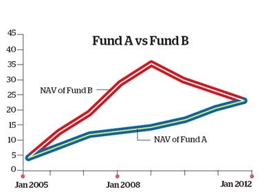 To know how your investment has grown on an annual basis, you’ll need to check the compounded annual growth rate (CAGR), in this case, 15.04%. Though CAGR can be calculated for any time period, a simple point-to-point return is preferred when the holding period is less than one year and CAGR is ideal for longer holding periods. Though it’s easy to calculate the point-to-point return and is extensively used to analyse fund performance, be warned that it’s not a fool-proof method. It fails to determine the consistency of the historical returns. If you consider the graph, both Fund A and Fund B have the same entry and exit NAVs. So a simple CAGR calculation would yield identical results, that is, 10.41%, while the absolute return for both funds is 100%. What’s different between the two funds is the consistency of their respective performance-Fund A is consistently rising whereas Fund B, after showing a robust growth for the first four years, declines consistently after 2009.