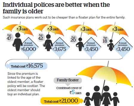 Floaters work best in case of young families. The premium is low because it is linked to the age of the eldest member in the plan. "A family floater cover is advisable when the oldest member is less than 45 years old," says Neeraj Basur, chief financial officer, Max Bupa Health Insurance.For 34-year-old Rakesh Somani, it is an ideal choice for insuring his family (see picture). "Since we are a young family and our healthcare costs are not too high, a floater plan of Rs 5 lakh should be sufficient for us," he says. Costly for older families However, the same may not be true for an older family, where the eldest member is more than 45 years old and the children are grown up. In such a case, individual policies may work out to be cheaper. The same is true if you want to insure an elderly member of the family. The premium can be prohibitive when you include a senior citizen (above 60) in the floater plan.