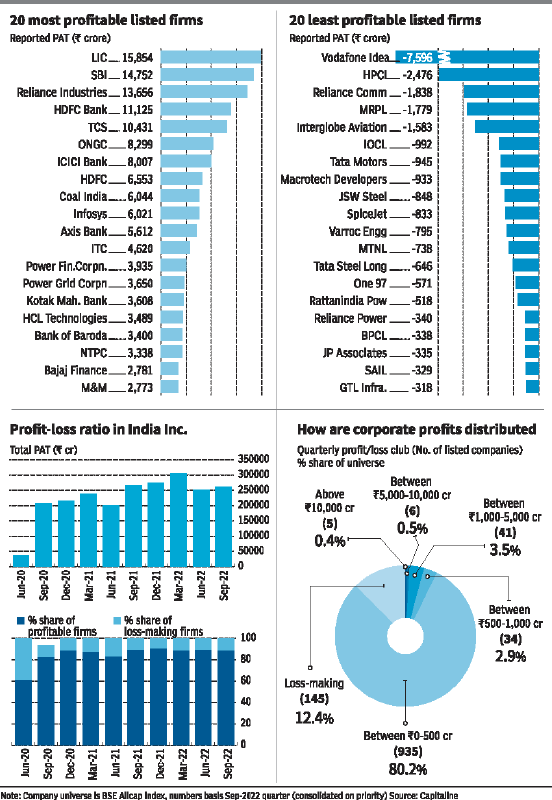 The 20 most profitable listed companies are led by LIC, SBI, Reliance Industries, HDFC Bank and TCS. They have cumulatively made over ₹ 1.37 lakh crore in the July-September quarter of 2022. Interestingly, these companies alone account for more than 50 per cent of the total profit clocked by over 1,100 firms.