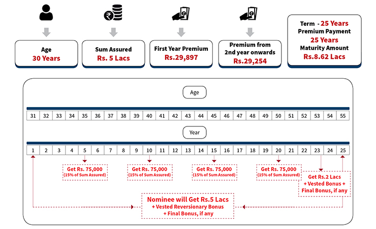 - This plan offers guaranteed tax-free 15% of Sum Assured in 5th, 10th, 15th & 20th Year of the policy. The premium payment term in this plan is 20 years.